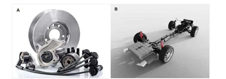 图1:技术清洁度对于汽车和电子行业中使用的零部件非常重要。A)各种汽车部件,包括轮毂、过滤罐、泵、火花塞电缆;B)混合动力汽车的发动机、传动系统、悬架、车轮和电池,电子显示和汽车部件。