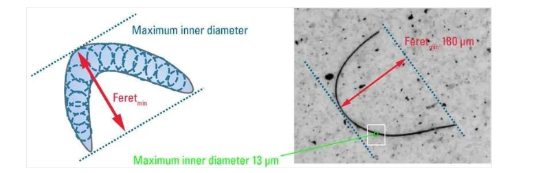 图3:利用光学显微镜测量弯曲纤维的宽度或长度。使用可以在光纤内部施加的最大圆形直径(13μm),现实地评估对其造成损害的风险。在这种情况下,最小费雷特直径(费雷特径min = 180 µm)不适用,因为它大大高估了损坏的可能性。