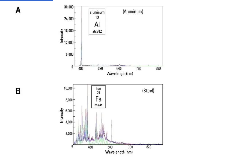 图4:根据清洁度分析中获得的LIBS光谱判断,颗粒由以下部分组成:A)主要成分是铝(Al)和B)钢(主要是铁)