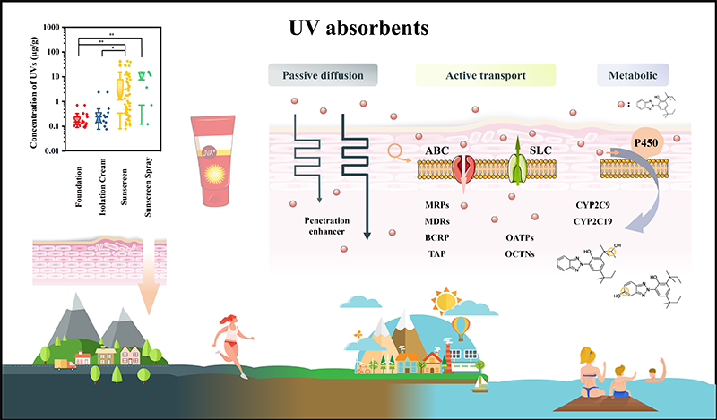 紫外线吸收剂和过滤剂在化妆品领域中主要用于防晒功能,但可能刺激皮肤、引发致敏反应,甚至进入体内循环引起健康风险。为保障消费者健康,一些国家已限制防晒类化妆品中紫外线吸收剂(ultraviolet absorbents, UVs)的使用。然而,因其与聚合物的良好兼容性,UVs仍被用于合成材料,并可能在化妆品生产过程中被无意引入。皮肤是防止有害物质渗透的重要屏障,但化妆品中渗促剂的存在可能增强UVs的透皮能力。尽管已有关于UVs环境行为的研究,但其在化妆品中的赋存情况仍不明确。本研究旨在确定防晒类化妆品中UVs的赋存及潜在来源,进一步探究其透皮机制,评估对人群的潜在风险。