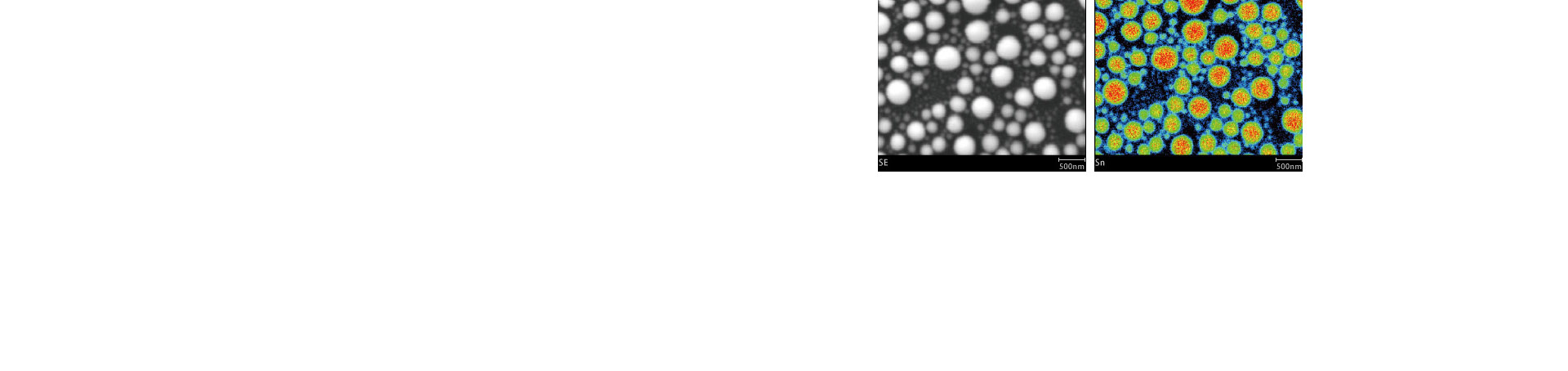 对碳膜上Sn球放大3万倍进行面分析。即使是SE图像(左侧)上直径只有50nm左右的Sn颗粒,