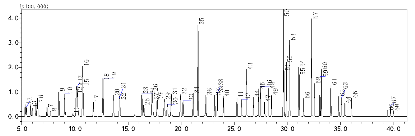 65种 VOCs标准气体和3种内标气体色谱图(1.0 nmol/mol)