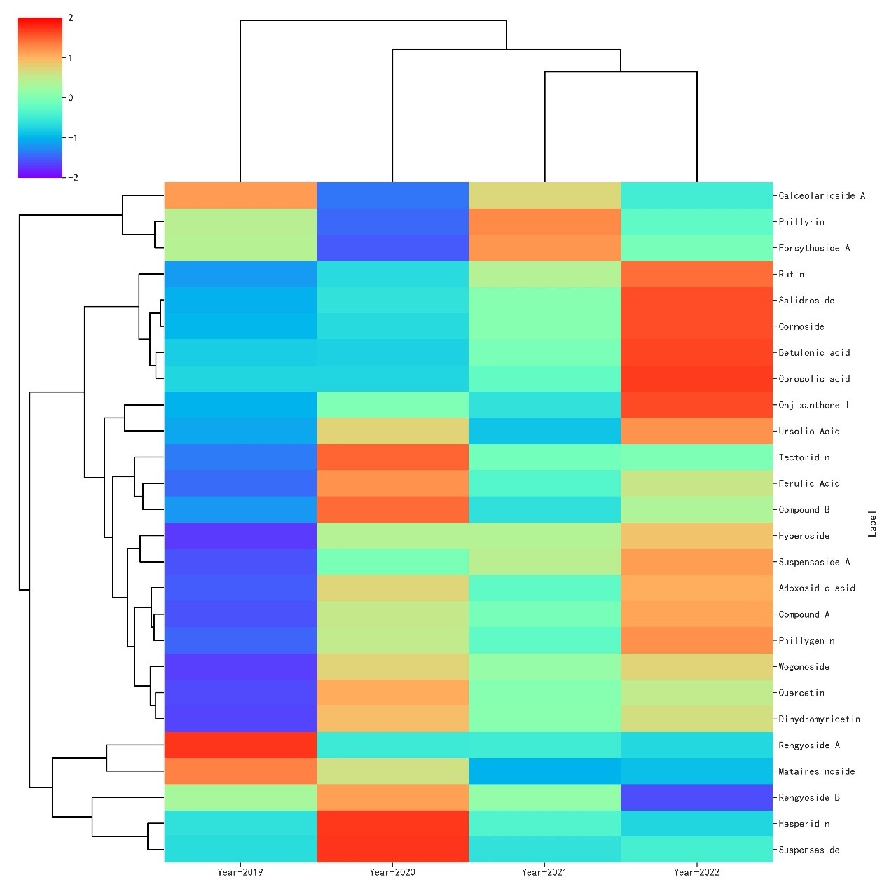 到目前为止,连翘饮片的保质期尚未确定。在司法鉴定领域,木本中药的保质期不应超过4年。如果储存条件良好,如没有腐败和发霉等情况发生,活性成分的变化应是决定连翘果实保质期的关键因素。在本研究中,比较了2022年收获的连翘果实和1-3年前(2021年、2020年和2019年)收获的连翘果实中的26种活性成分的差异。所有样本均于2023年7月进行了分析。以2022年的连翘果实为例,其保存时间为一年。把log(单个活性成分在收获年份的含量/2022年相应的成分含量)对收获年份绘制聚类热图(图4,每个年份的样品平行测量三次)。可以看出,随着储存时间的延长,大多数活性成分在果实中的含量会显著下降。还有五种成分的呈相反趋势(连翘环己醇苷A/B、连翘苷、橙皮苷和罗汉松脂苷)。显然,考虑到大多数活性成分的变化,建议连翘饮片的保质期为三年;仅考虑连翘酯苷A和连翘苷两种成分的变化,建议其保质期为两年。